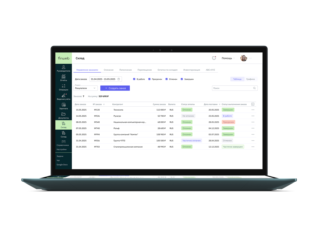 Удобно контролировать оплату и исполнение заказов с помощью статусов